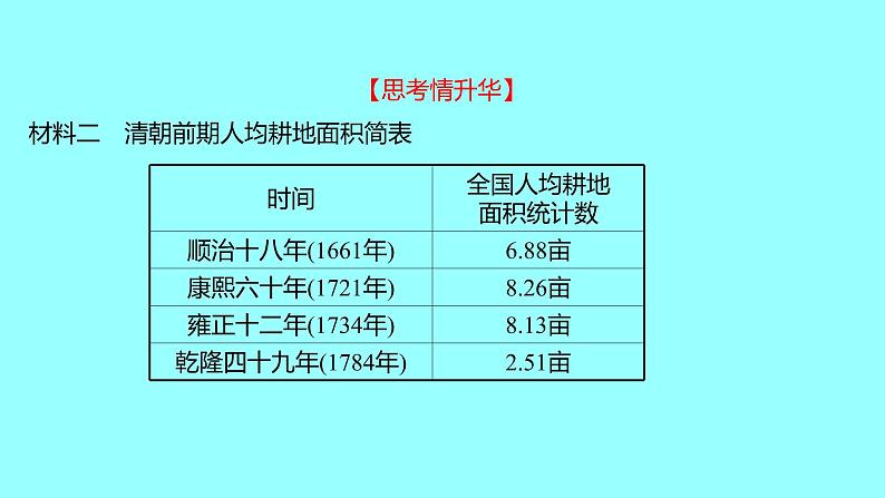 【思考情升华】材料二 清朝前期人均耕地面积简表