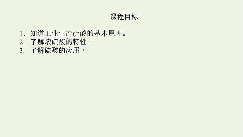 展开课程目标1.知道工业生产硫酸的基本原理。2.了解浓硫酸的特性。3.了解硫酸的应用。