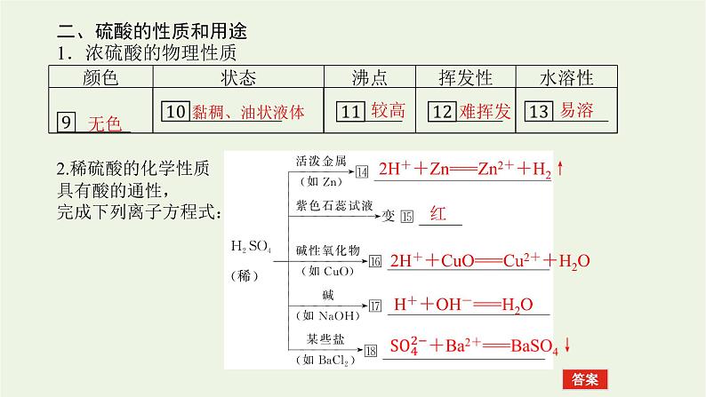 4.硫酸的用途(1)制造化肥、医药、农药。(2)金属矿石的处理、金属材料的表面清洗。(3)制取硫酸盐,制取难挥发性酸。(4)化学试剂。