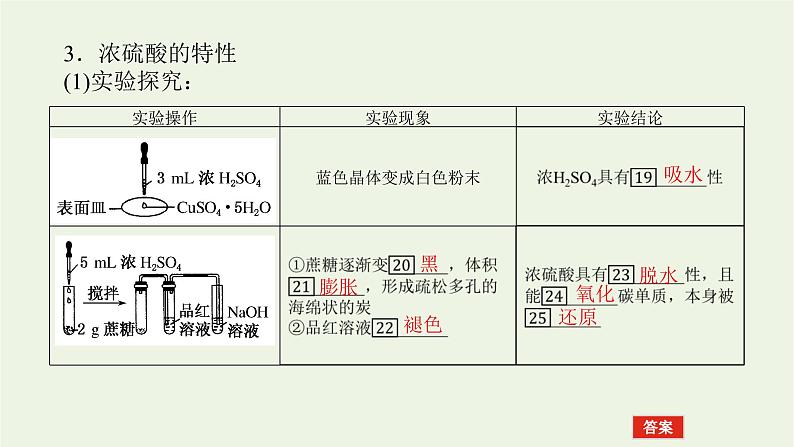 状元随笔 浓硫酸吸水性和脱水性的区别:吸水性:浓硫酸吸取物质中本身存在的水或结晶水的性质。脱水性:浓硫酸将组成有机物的H、O元素按原子个数比2∶1以“H2O”的形式脱去的性质由此看出:二者的根本区别在于物质本身是否存在水分子。