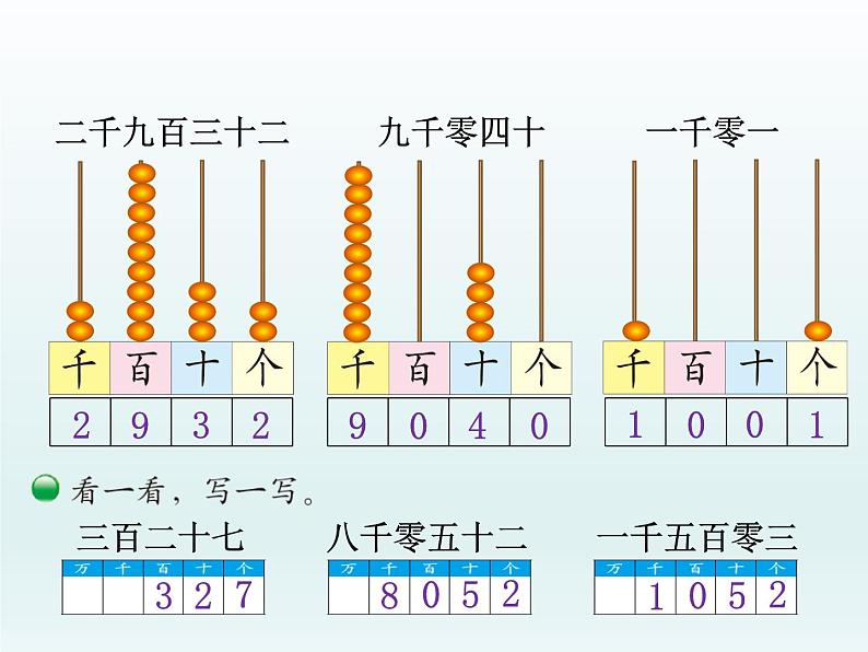 小学数学北师大版二年级下册拨一拨备课课件ppt: 这是一份小学数学北师大版二年级下册拨一拨备课课件ppt,共11页。PPT课件主要包含了数位顺序表,二千九百三十二,九千零四十,一千零一,三百二十七,八千零五十二,一千五百零三等内容,欢迎下载使用。