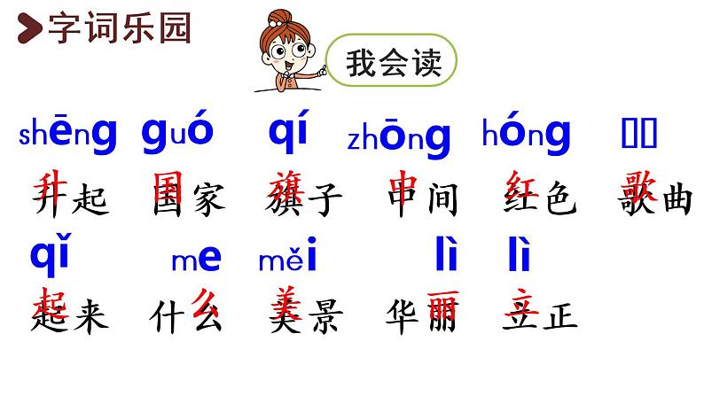 这是一份2021学年10 升国旗教课内容ppt课件,共20页。PPT课件主要包含了升国旗中红,旗起立丽,演一演读一读,演一演背一背等内容,欢迎下载使用。