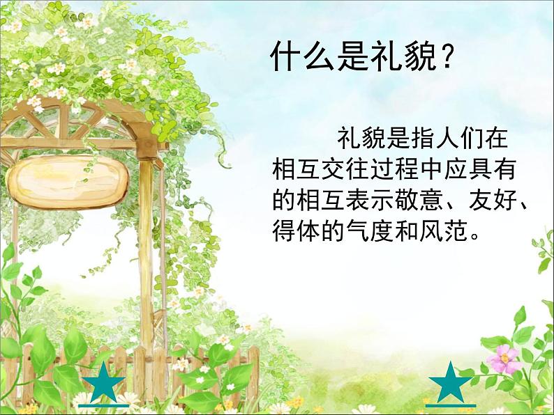 礼貌是指人们在相互交往过程中应具有的相互表示敬意、友好、得体的气度和风范。