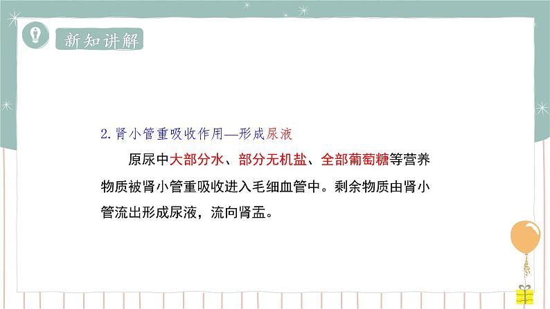 2.肾小管重吸收作用—形成尿液 原尿中大部分水、部分无机盐、全部葡萄糖等营养物质被肾小管重吸收进入毛细血管中。剩余物质由肾小管流出形成尿液,流向肾盂。