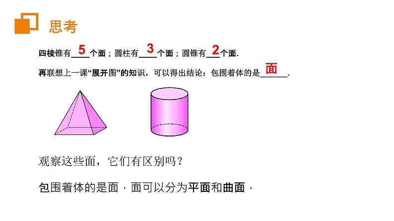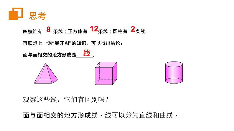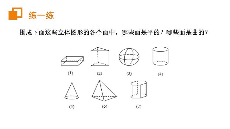 第四章 几何图形初步人教版 数学(初中) (七年级 上)主讲人:X X X时间:20XX.XXLOGO前 言学习目标1、理解点、线、面、体的概念。2、理解点、线、面、体之间的关系。3、通过学习点、线、面、体之间的关系,进一步发展抽象概括能力和形象思维能力。重点难点重点:点、线、面、体之间的关系。难点:理解点动成线,线动成面,面动成体。观察立方体,回答下面问题?1)立方体有几个面?2)面与面相交的地方形成了几条棱?3)棱与棱相交成几个顶点?①②⑤⑥③④6个12条8个思 考 立体图形又叫做几何体,简称为体。生活中常见的几何体四棱锥有____个面;圆柱有____个面;圆锥有___个面.再联想上一课“展开图”的知识,可以得出结论:包围着体的是______.观察这些面,它们有区别吗?包围着体的是面,面可以分为平面和曲面.532面 思考你能说一些生活中常见的平面和曲面吗?生活中常见的平面和曲面围成下面这些立体图形的各个面中,哪些面是平的?哪些面是曲的?练一练四棱锥有____条线;正方体有____条线;圆柱有___条线.再联想上一课“展开图”的知识,可以得出结论:面与面相交的地方形成是______.观察这些线,它们有区别吗?面与面相交的地方形成线,线可以分为直线和曲线.8122线 思考你能说一些生活中常见的直线和曲线吗?生活中常见的直线和曲线观察下面这些立方体,哪些线是直的?哪些线是曲的?练一练四棱锥有____个点;正方体有____个点.再联想上一课“展开图”的知识,可以得出结论:线与线相交的地方形成是______.观察这些点,它们有大小区别吗?线与线相交的地方形成点,点无大小.512点 思考你能说一些生活中常见的点吗?生活中常见的点观察子弹射出的过程,你发现了什么?点动成线思考观察雨刷器工作的过程,你发现了什么?线动成面思考观察下面的旋转过程中,你发现了什么?面动成体思考1.(2019·山东奚仲中学初一月考)一个几何体的展开图如图所示,则该几何体的顶点有( ).A.6 B.8 C.9 D.10【详解】解:还原几何体为三棱柱,则顶点有6个;故答案为A.课堂测试2.将下面的平面图形绕虚线旋转一周,得到的立体图形是( )【详解】解:直角三角形绕直角边旋转一周可得圆锥,长方形绕一边旋转一周可得圆柱,那么所求的图形是下面是圆锥,上面是圆柱的组合图形.故选:C.课堂测试3.如图,把左面图中的图形绕着虚线所在直线旋转一周,可以得到右面图形中的( )【详解】解:根据面动成体结合常见立体图形的形状得出只有A选项符合,故选:A.课堂测试4.圆锥可以看作是由一个________旋转得到的.( )A.矩形(长方形) B.等腰梯形 C.半圆 D.直角三角形【详解】解:圆锥可以看作是由一个直角三角形绕一条直角边旋转一周得到的,故选:D.课堂测试第四章 几何图形初步人教版 数学(初中) (七年级 上)主讲人:X X X时间:20XX.XXLOGO
