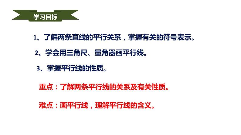 1、了解两条直线的平行关系,掌握有关的符号表示。
