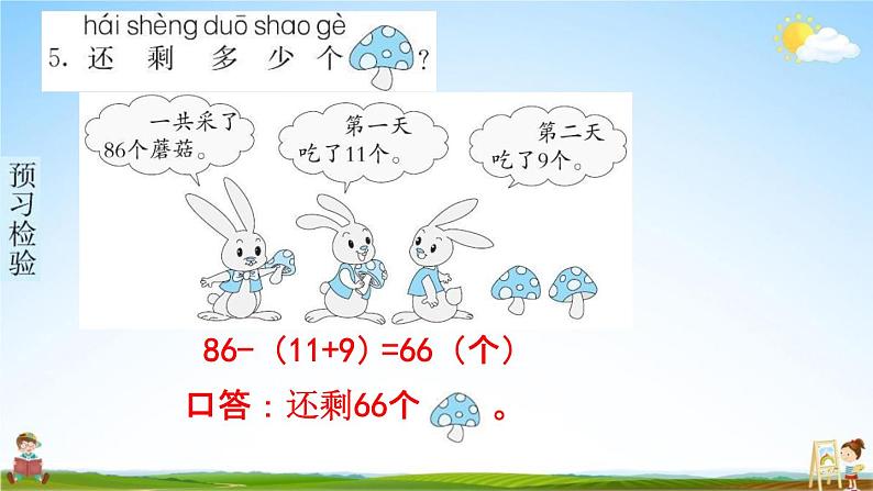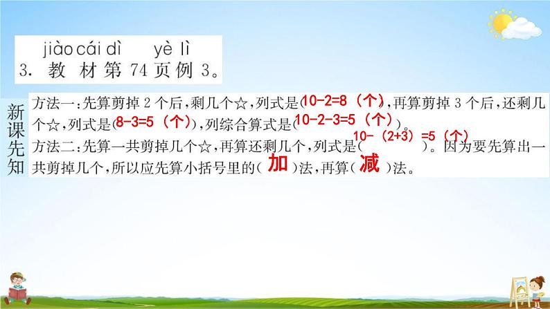 15-3-4 =8(个)15-(3+4)=8(个) 口答:还剩下8个。