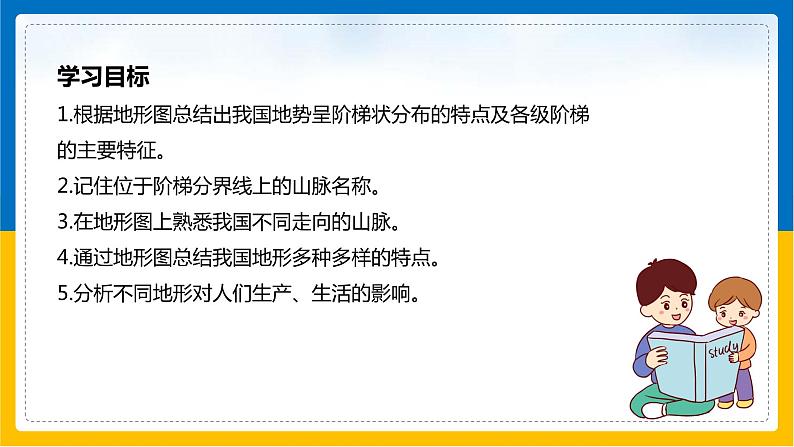学习目标1.根据地形图总结出我国地势呈阶梯状分布的特点及各级阶梯的主要特征。2.记住位于阶梯分界线上的山脉名称。3.在地形图上熟悉我国不同走向的山脉。4.通过地形图总结我国地形多种多样的特点。5.分析不同地形对人们生产、生活的影响。
