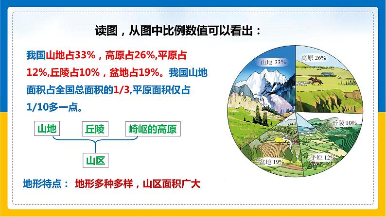 我国山地占33%,高原占26%,平原占12%,丘陵占10%,盆地占19%。我国山地面积占全国总面积的1/3,平原面积仅占1/10多一点。