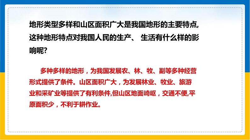 地形类型多样和山区面积广大是我国地形的主要特点,这种地形特点对我国人民的生产、 生活有什么样的影响呢?