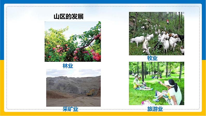多种多样的地形,为我国发展农、林、牧、副等多种经营形式提供了条件。山区面积广大,为发展林业、牧业、旅游业和采矿业等提供了有利条件,但山区地面崎岖,交通不便,平原面积少,不利于耕作业。