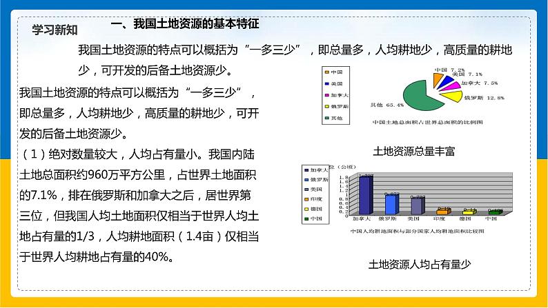 (1)绝对数量较大,人均占有量小。我国内陆土地总面积约960万平方公里,占世界土地面积的7.1%,排在俄罗斯和加拿大之后,居世界第三位,但我国人均土地面积仅相当于世界人均土地占有量的1/3,人均耕地面积(1.4亩)仅相当于世界人均耕地占有量的40%。