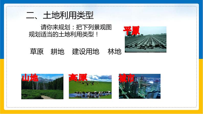 请你来规划:把下列景观图规划适当的土地利用类型!