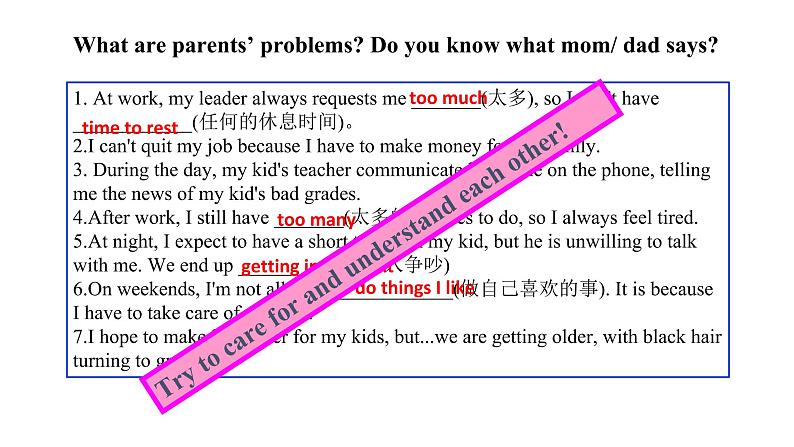 1. At wrk, my leader always requests me _______(太多), s I dn't have ____________(任何的休息时间)。2.I can't quit my jb because I have t make mney fr the family.3. During the day, my kid's teacher cmmunicated with me n the phne, telling me the news f my kid's bad wrk, I still have _______(太多的) chres t d, s I always feel night, I expect t have a shrt talk with my kid, but he is unwilling t talk with me. We end up ____________(陷入争吵)6.On weekends, I'm nt allwed ____________(做自己喜欢的事). It is because I have t take care f my kids. 7.I hpe t make life better fr my kids, are getting lder, with black hair turning t grey.
