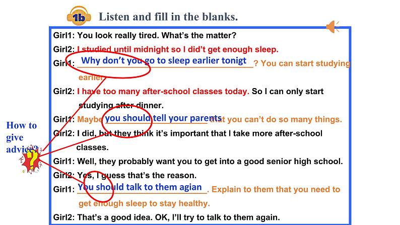 Girl1: Yu lk really tired. What’s the matter?Girl2: I studied until midnight s I did’t get enugh sleep.Girl1: ______________________________________? Yu can start studying earlier.Girl2: I have t many after-schl classes tday. S I can nly start studying after dinner.Girl1: Maybe ______________________ that yu can’t d s many things.Girl2: I did, but they think it’s imprtant that I take mre after-schl classes. Girl1: Well, they prbably want yu t get int a gd senir high schl.Girl2: Yes, I guess that’s the reasn.Girl1: ____________________________. Explain t them that yu need t get enugh sleep t stay healthy.Girl2: That’s a gd idea. OK, I’ll try t talk t them again.