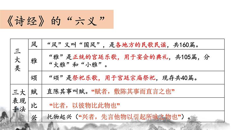 “雅”是正统的宫廷乐歌,用于宴会的典礼,共105篇,分“大雅”和“小雅”。