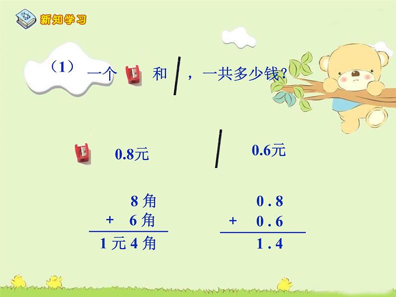 这是一份人教版三年级下册7 小数的初步认识简单的小数加、减法课文ppt课件,共15页。PPT课件主要包含了请计算下面各题,7-14,+64,5-29,复习引入,探究新知,一加法,你知道了什么,问题是什么,你想怎样解决等内容,欢迎下载使用。