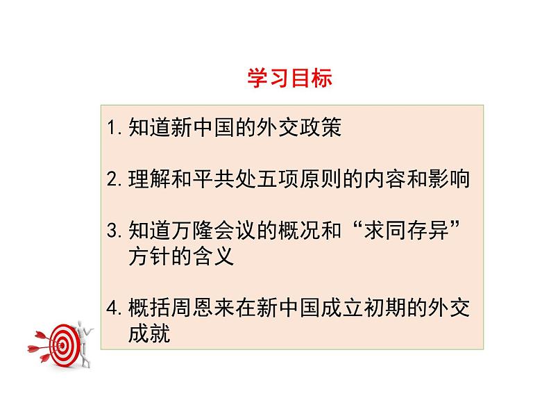 这是一份初中历史人教部编版八年级下册第16课 独立自主的和平外交图文ppt课件,共28页。PPT课件主要包含了学习目标,和平共处五项原则,本课小结,随堂练习等内容,欢迎下载使用。