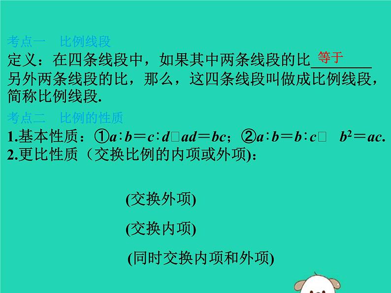 考点一 比例线段定义:在四条线段中,如果其中两条线段的比________另外两条线段的比,那么,这四条线段叫做成比例线段,简称比例线段.考点二 比例的性质1.基本性质:①a∶b=c∶dad=bc;②a∶b=b∶c b2=ac.2.更比性质(交换比例的内项或外项):