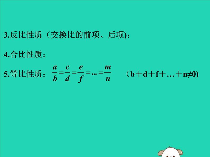 3.反比性质(交换比的前项、后项): 4.合比性质: 5.等比性质: (b+d+f+…+n≠0)