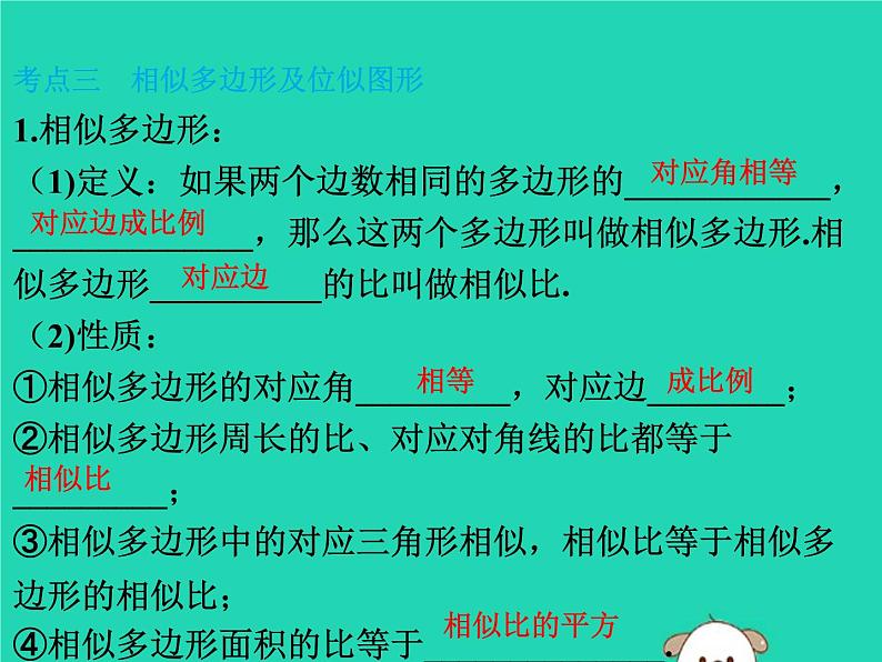 考点三 相似多边形及位似图形1.相似多边形:(1)定义:如果两个边数相同的多边形的____________,______________,那么这两个多边形叫做相似多边形.相似多边形__________的比叫做相似比.(2)性质:①相似多边形的对应角_________,对应边________;②相似多边形周长的比、对应对角线的比都等于_________;③相似多边形中的对应三角形相似,相似比等于相似多边形的相似比;④相似多边形面积的比等于______________.