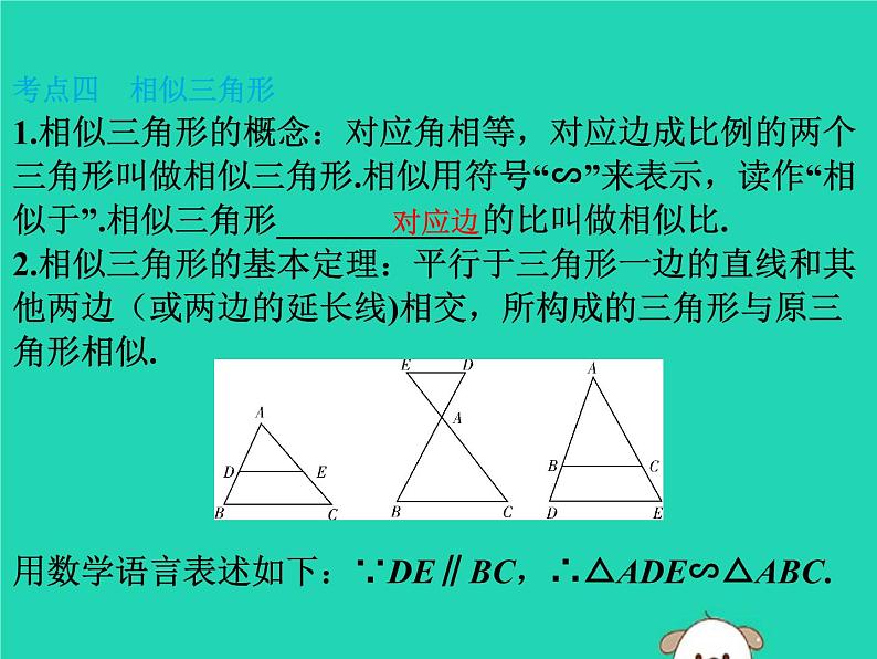 考点四 相似三角形1.相似三角形的概念:对应角相等,对应边成比例的两个三角形叫做相似三角形.相似用符号“∽”来表示,读作“相似于”.相似三角形____________的比叫做相似比.2.相似三角形的基本定理:平行于三角形一边的直线和其他两边(或两边的延长线)相交,所构成的三角形与原三角形相似.用数学语言表述如下:∵DE∥BC,∴△ADE∽△ABC.