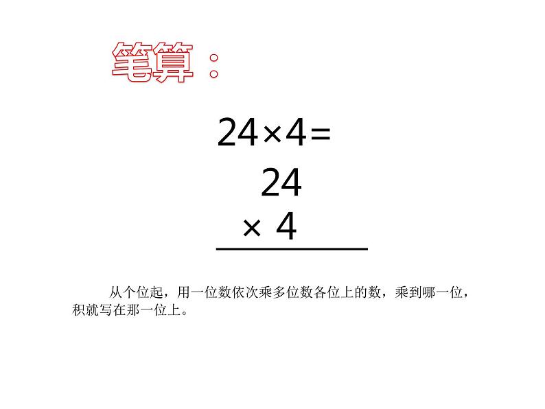 从个位起,用一位数依次乘多位数各位上的数,乘到哪一位,积就写在那一位上。