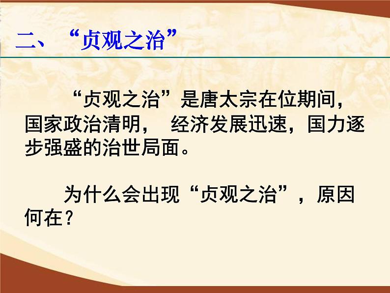 “贞观之治”是唐太宗在位期间,国家政治清明, 经济发展迅速,国力逐步强盛的治世局面。 为什么会出现“贞观之治”,原因何在?