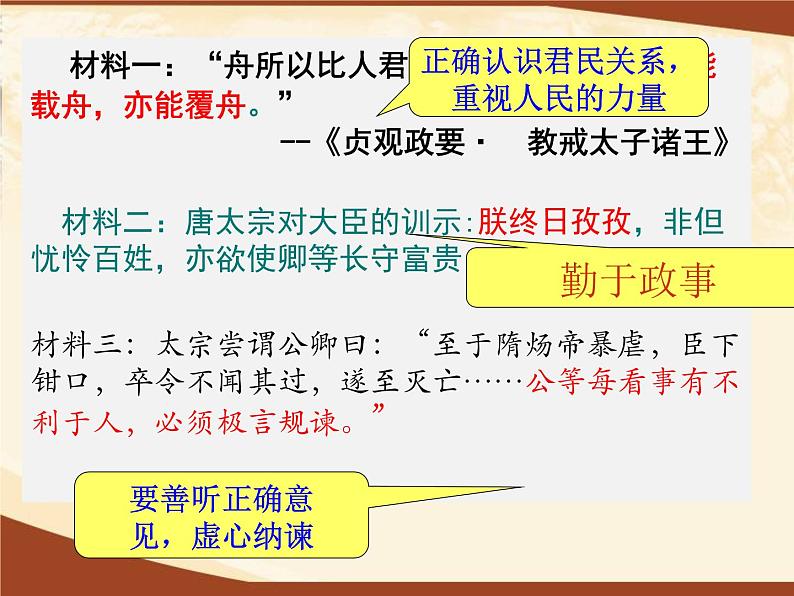 材料一:“舟所以比人君,水所以比黎庶,水能载舟,亦能覆舟。”--《贞观政要· 教戒太子诸王》 材料二:唐太宗对大臣的训示:朕终日孜孜,非但忧怜百姓,亦欲使卿等长守富贵。 材料三:太宗尝谓公卿曰:“至于隋炀帝暴虐,臣下钳口,卒令不闻其过,遂至灭亡……公等每看事有不利于人,必须极言规谏。”