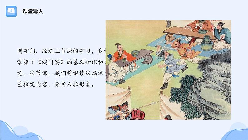 同学们,经过上节课的学习,我们已经掌握了《鸿门宴》的基础知识和文章大意。这节课,我们将继续这篇课文,着重探究内容,分析人物形象。
