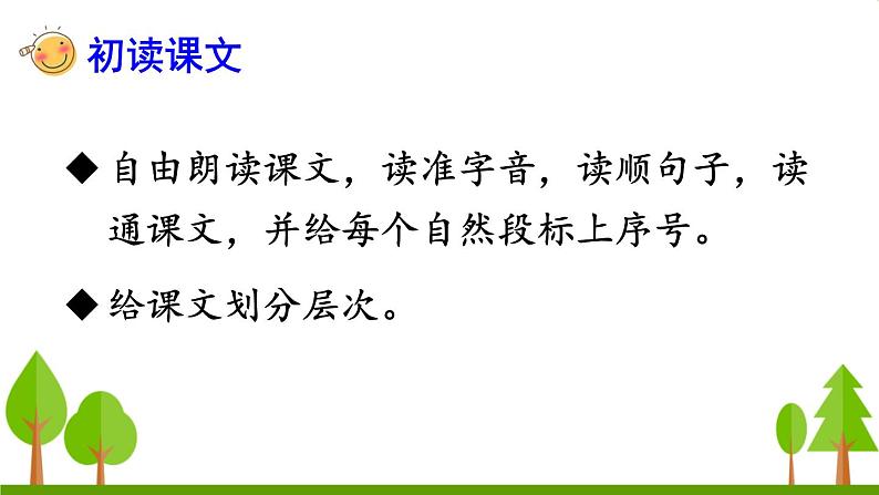 展开自由朗读课文,读准字音,读顺句子,读通课文,并给每个自然段标上序号。给课文划分层次。
