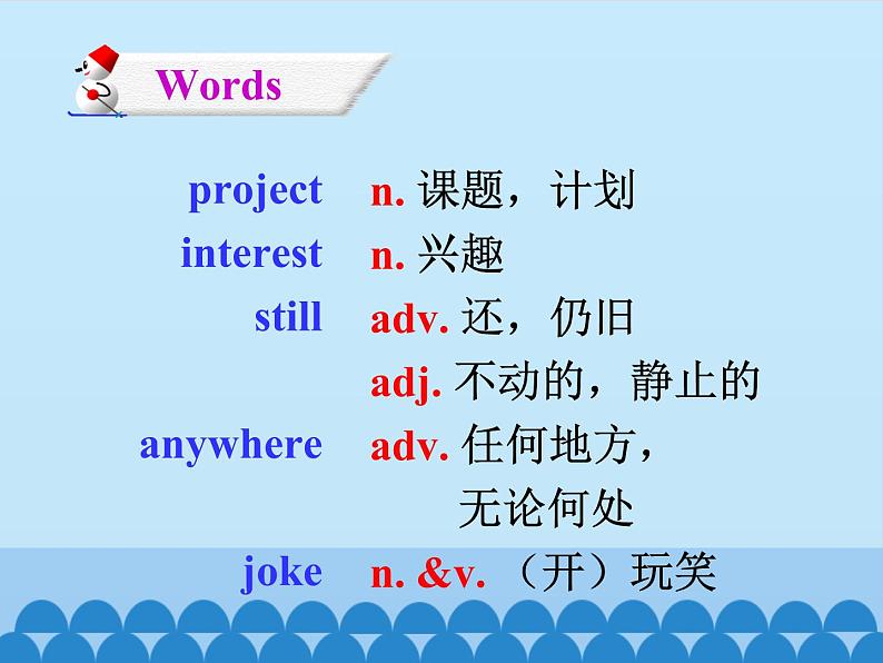 n. 课题,计划n. 兴趣adv. 还,仍旧adj. 不动的,静止的adv. 任何地方, 无论何处n. &v. (开)玩笑