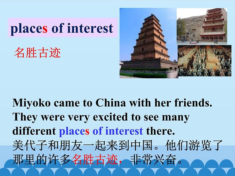 2. places f interest 名胜古迹Which places f interest in China wuld yu like t visit?你想去参观中国的哪些名胜古迹?There are many places f interest in the city f Beijing.北京城里有许多名胜古迹。
