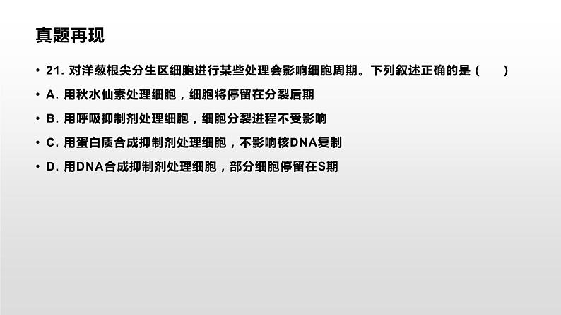 21. 对洋葱根尖分生区细胞进行某些处理会影响细胞周期。下列叙述正确的是( )A. 用秋水仙素处理细胞,细胞将停留在分裂后期B. 用呼吸抑制剂处理细胞,细胞分裂进程不受影响C. 用蛋白质合成抑制剂处理细胞,不影响核DNA复制D. 用DNA合成抑制剂处理细胞,部分细胞停留在S期