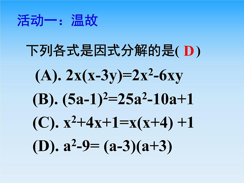 下列各式是因式分解的是( ) (A). 2x(x-3y)=2x2-6xy (B). (5a-1)2=25a2-10a+1 (C). x2+4x+1=x(x+4) +1 (D). a2-9= (a-3)(a+3)