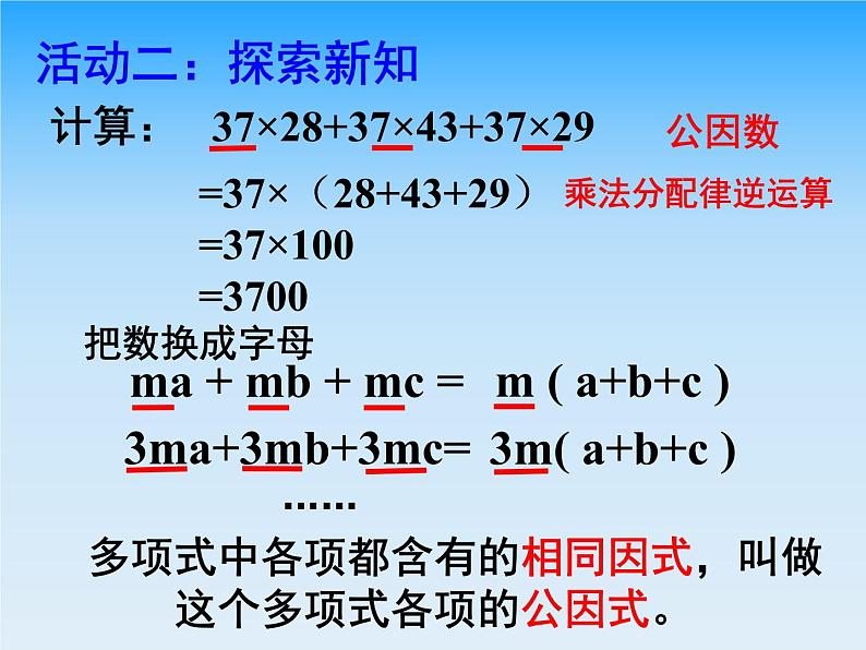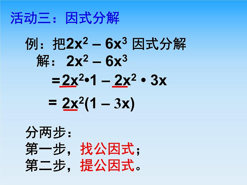 2、提公因式法因式分解:找公因式;提公因式 (注意提尽,符号,项)