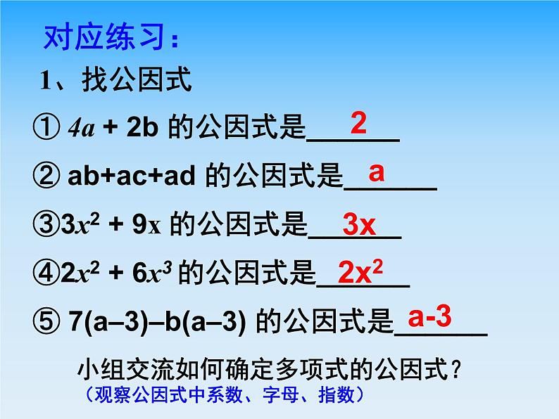 小组交流如何确定多项式的公因式?(观察公因式中系数、字母、指数)