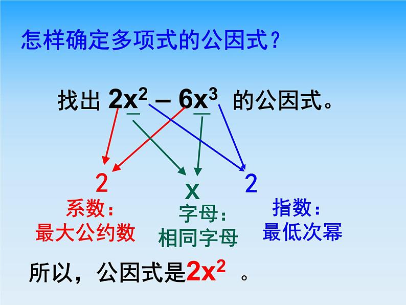 1、确定公因式的方法:系数 :最大公约数字母:相同指数 :最低次幂