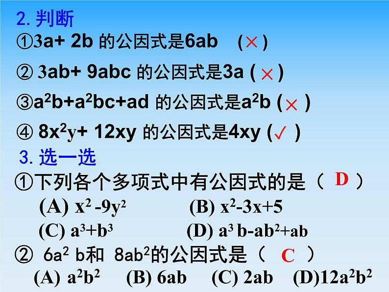 3.选一选①下列各个多项式中有公因式的是( ) (A) x2 -9y2 (B) x2-3x+5 (C) a3+b3 (D) a3 b-ab2+ab② 6a2 b和 8ab2的公因式是( ) (A) a2b2 (B) 6ab (C) 2ab (D)12a2b2