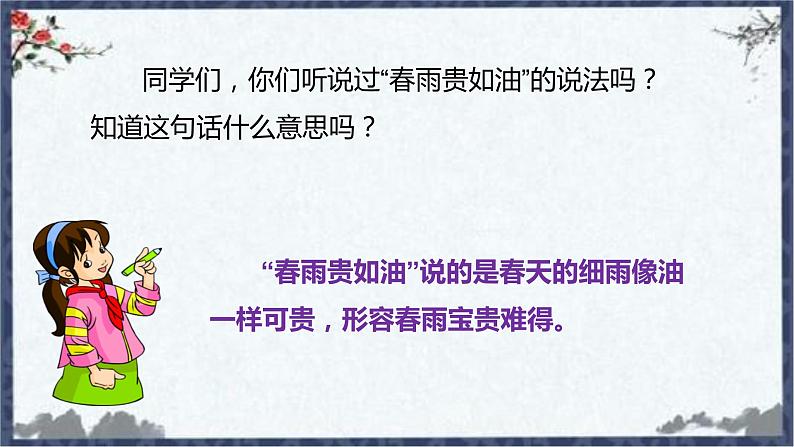 展开同学们,你们听说过“春雨贵如油”的说法吗?知道这句话什么意思吗?