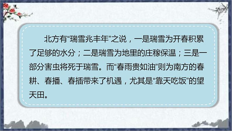 北方有“瑞雪兆丰年”之说,一是瑞雪为开春积累了足够的水分;二是瑞雪为地里的庄稼保温;三是一部分害虫将死于瑞雪。而“春雨贵如油”则为南方的春耕、春播、春插带来了机遇,尤其是“靠天吃饭”的望天田。