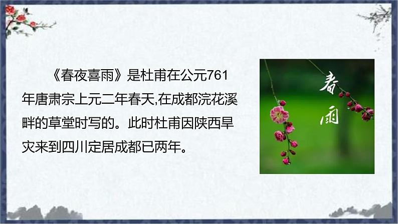 《春夜喜雨》是杜甫在公元761年唐肃宗上元二年春天,在成都浣花溪畔的草堂时写的。此时杜甫因陕西旱灾来到四川定居成都已两年。