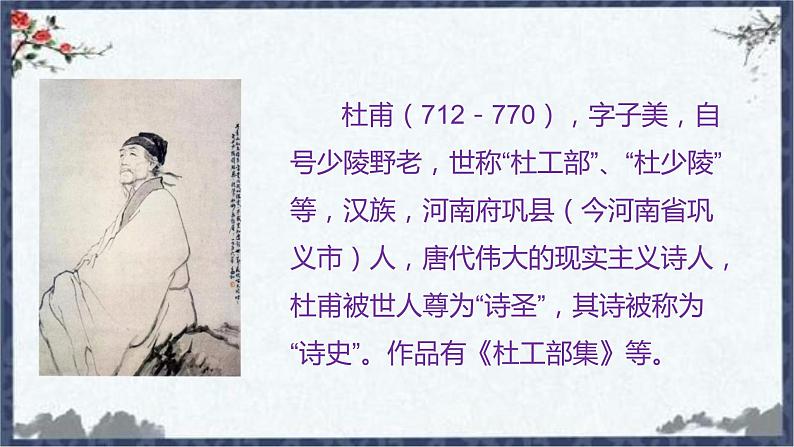 杜甫(712-770),字子美,自号少陵野老,世称“杜工部”、“杜少陵”等,汉族,河南府巩县(今河南省巩义市)人,唐代伟大的现实主义诗人,杜甫被世人尊为“诗圣”,其诗被称为“诗史”。作品有《杜工部集》等。