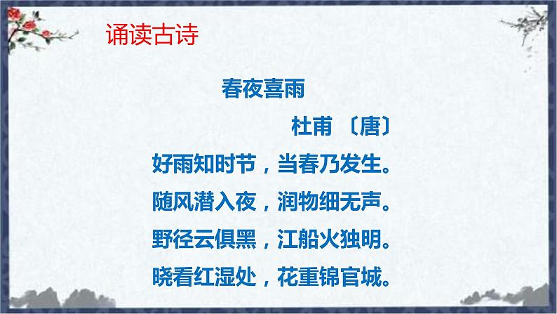 2020-2021学年3 江畔独步寻花教案配套ppt课件: 这是一份2020-2021学年3 江畔独步寻花教案配套ppt课件,共22页。PPT课件主要包含了春夜喜雨,小组学生汇报,学生汇报教师总结等内容,欢迎下载使用。