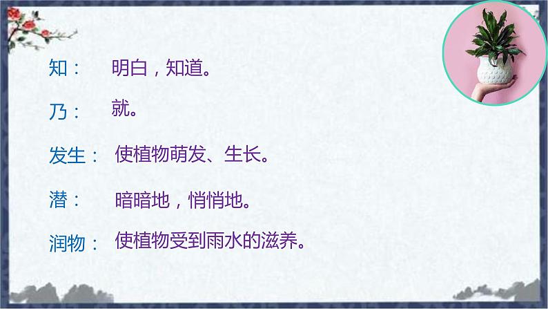 诗意:好雨是知道该下雨的时节的,正好下在春天植物萌发生长的时候。