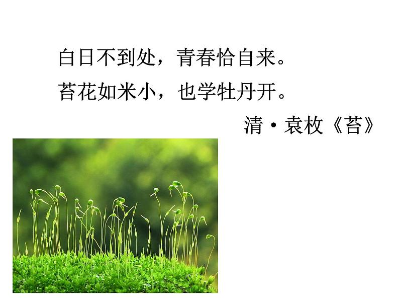 这是一份北师大版八年级下册第3节 植物的主要类群课文内容课件ppt,共23页。PPT课件主要包含了清·袁枚《苔》,讨论交流,校园里的苔藓植物,活动观察苔藓植物,苔藓植物,活动观察蕨类植物,你知道吗,蕨类植物,蕨叶片背面的孢子囊,植物进化系统树等内容,欢迎下载使用。