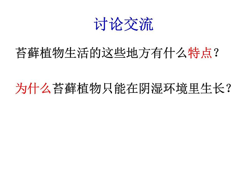 结构简单:还没有进化出吸水、 长距离输送水的结构植株矮小,必须依赖阴湿的环境