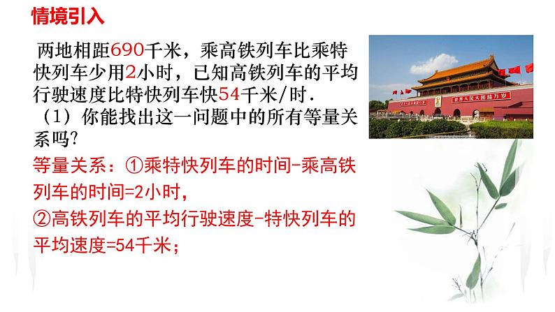 展开两地相距690千米,乘高铁列车比乘特快列车少用2小时,已知高铁列车的平均行驶速度比特快列车快54千米/时. (1)你能找出这一问题中的所有等量关系吗?等量关系:①乘特快列车的时间-乘高铁列车的时间=2小时,②高铁列车的平均行驶速度-特快列车的平均速度=54千米;