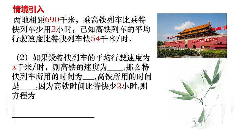 两地相距690千米,乘高铁列车比乘特快列车少用2小时,已知高铁列车的平均行驶速度比特快列车快54千米/时. (2)如果设特快列车的平均行驶速度为x千米/时,则高铁的速度为____,那么特快列车所用的时间为___,高铁所用的时间是____,因为高铁时间比特快少2小时,则方程为_____________________