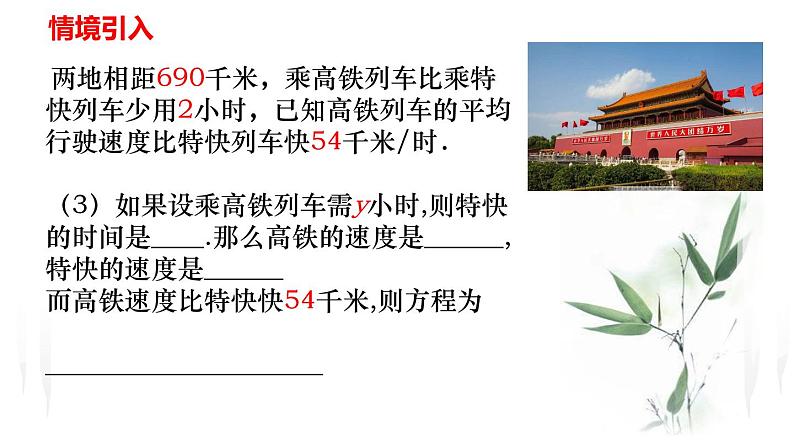 两地相距690千米,乘高铁列车比乘特快列车少用2小时,已知高铁列车的平均行驶速度比特快列车快54千米/时. (3)如果设乘高铁列车需y小时,则特快的时间是____.那么高铁的速度是______,特快的速度是______而高铁速度比特快快54千米,则方程为_____________________